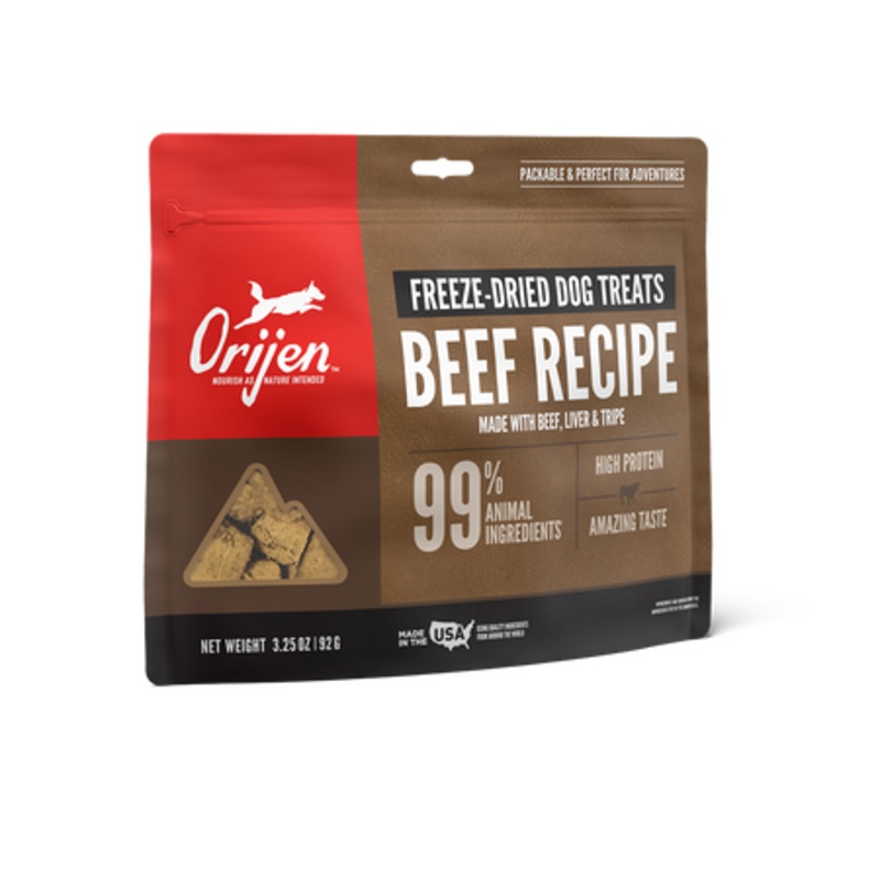 Treat your dog to delicious and nutritious ORIJENFreeze-Dried Treats. Packed with animal protein, our Beef Recipe is made with 99%* animal ingredients including nourishing beef, liver and tripe. Freeze-dried to lock in their rich nutrients and flavor, they