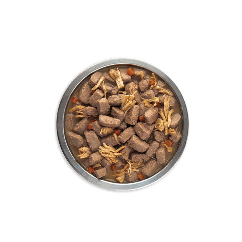Help your dog thrive with the power of protein-rich ORIJEN Chicken Recipe Stew with Shredded Chicken and Eggs Wet Dog Food. This ORIJEN dog food diet is made with rich inclusions of savory chicken shreds that will help your dog thrive. With a Biologically Appropriate recipe, this wet dog food is based on what your canine’s ancestors consumed in the wild. Packed with 95 percent animal ingredients*, ORIJEN wet dog food provides a high protein diet that will nourish a lifetime of adventures. ORIJEN WholePrey ingredients including organs and bones provide your dog with the most succulent and nutrient-rich parts of prey. Feed your dog ORIJEN wet dog food alone to add moisture and nourishment to their diet, or add it on top of ORIJEN kibble for a nutritious addition at mealtime. Our included fresh ingredients are delivered refrigerated and our included raw ingredients are delivered frozen. NOURISH AS NATURE INTENDED. *Approximate 95 percent, and excludes water for processing.