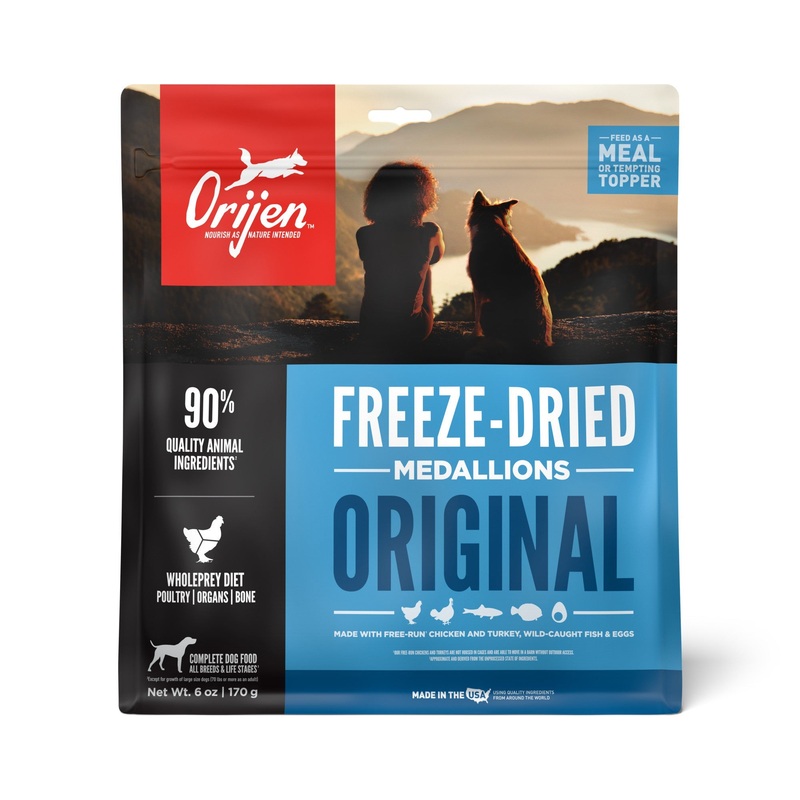 ORIJENFreeze-Dried Medallions provide your dog with a rich, concentrated source of animal protein and nutrients in a convenient dry form. ORIJEN Original Freeze-Dried Medallions are made with a savory blend of free-run1 chicken and turkey, wild-caught fish