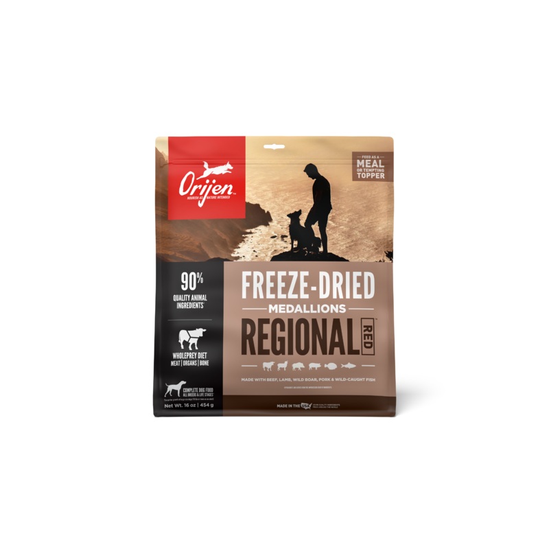 Help your dog thrive with the power of protein-rich ORIJEN REGIONAL RED Freeze Dried Medallions. This ORIJEN freeze dried dog food and topper is a concentrated source of animal protein that’s freeze dried to lock in the rich nutrients and flavor of raw animal ingredients. With a Biologically Appropriate recipe, this high protein dog food is based on what your canine’s ancestors consumed in the wild. Containing up to 90 percent quality animal ingredients*, ORIJEN grain free** freeze dried dog food provides a high protein diet that will nourish a lifetime of adventures. Ingredients include beef, lamb, wild boar, pork and wild-caught fish, giving your dog a strong source of protein, vitamins and minerals. ORIJEN WholePrey ingredients including organs and bones provide your dog with the most succulent and nutrient-rich parts of prey. Serve this dog food as a nutrient-rich meal by adding warm water and stirring or add it to your dog’s favorite meal by crumbing ORIJEN REGIONAL RED freeze dried medallions and using them as a dog food topper. Our included fresh ingredients are delivered refrigerated and our included raw ingredients are delivered frozen. *Approximate 90%, and derived from the unprocessed state of the ingredients **Produced in a facility that also processes grains One (1) 16 oz bag of ORIJEN REGIONAL RED Freeze Dried Medallions Dog Food & Topper ORIJEN freeze dried dog food is a concentrated source of animal protein that can be served as a meal or used as a dog food topper ORIJEN dog food kibble containing up to 90 percent quality animal ingredients*, including WholePrey ingredients like bones and organs to mimic what your dog’s ancestors consumed in the wild A WholePrey diet, so your dog can get a high protein dog food with the protein, vitamins and minerals they need Freeze dried dog food medallions made in the USA with the worlds finest ingredients