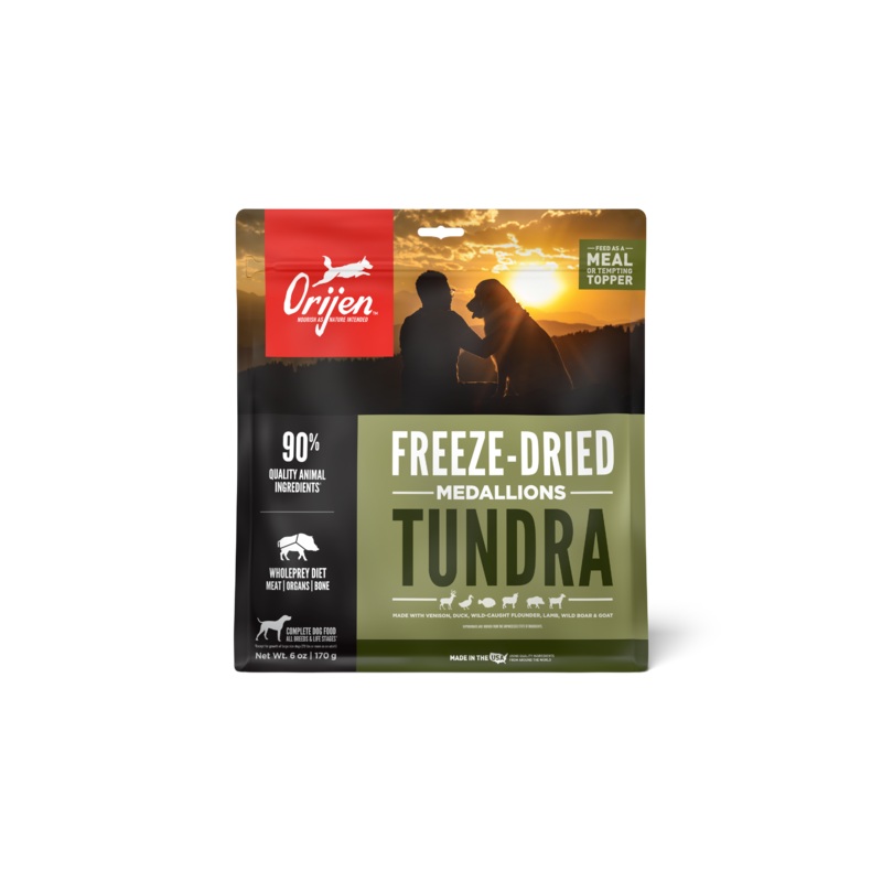 Help your dog thrive with the power of protein-rich ORIJEN TUNDRA Freeze Dried Medallions. This ORIJEN freeze dried dog food and topper is a concentrated source of animal protein that’s freeze dried to lock in the rich nutrients and flavor of raw animal ingredients. With a Biologically Appropriate recipe, this high protein dog food is based on what your canine’s ancestors consumed in the wild. Containing up to 90 percent quality animal ingredients*, ORIJEN grain free** freeze dried dog food provides a high protein diet that will nourish a lifetime of adventures. Ingredients include venison, duck, wild-caught flounder, whole herring, lamb, wild boar and goat, giving your dog a strong source of protein, vitamins and minerals. ORIJEN WholePrey ingredients including organs and bones provide your dog with the most succulent and nutrient-rich parts of prey. Serve this dog food as a nutrient-rich meal by adding warm water and stirring or enhance your dog’s favorite meal by crumbling ORIJEN TUNDRA freeze dried medallions and using them as a dog food topper. Our included fresh ingredients are delivered refrigerated and our included raw ingredients are delivered frozen. *Approximate 90%, and derived from the unprocessed state of the ingredients. **Produced in a facility that also processes grains One (1) 16 oz bag of ORIJEN TUNDRA Freeze Dried Medallions Dog Food & Topper ORIJEN freeze dried dog food is a concentrated source of animal protein that can be served as a meal or used as a dog food topper Grain free** freeze dried dog food containing up to 90 percent quality animal ingredients*, including WholePrey ingredients like bones and organs to mimic what your dog’s ancestors consumed in the wild Freeze dried dog food medallions lock in the rich nutrients and flavor of raw animal ingredients for a taste dogs instinctively crave ORIJEN dog food is made in the USA using quality ingredients from around the world