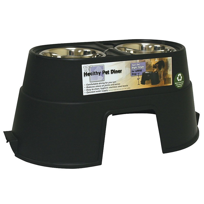 DescriptionJust right for large dogs! Please your pet with a designer diner that provides a fashionable and ergonomically correct feeding position.Includes feeder and two 2-qt stainless steel bowlsDurable plastic baseMeasures 27" x 13-3/4" x 12-1/2"