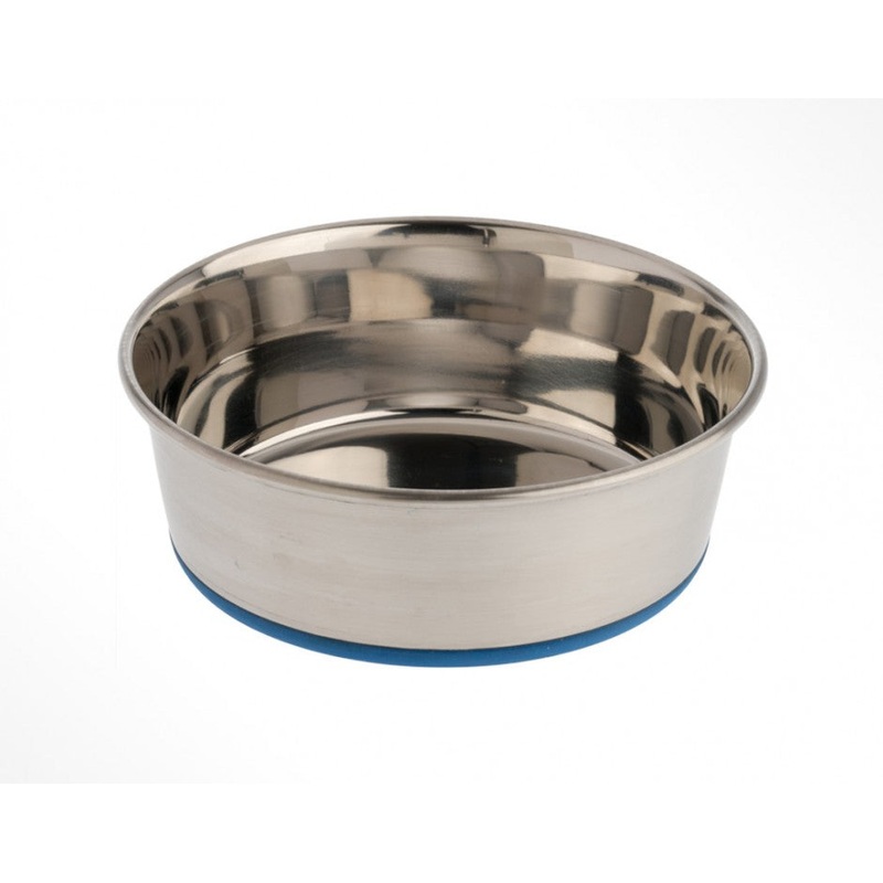 OurPets bowls are made of high-quality, heavy-duty stainless steel with a permanently-molded rubber ring on the base of the bowl that prevents sliding and noise. They are dishwasher-safe and scratch-resistant.
