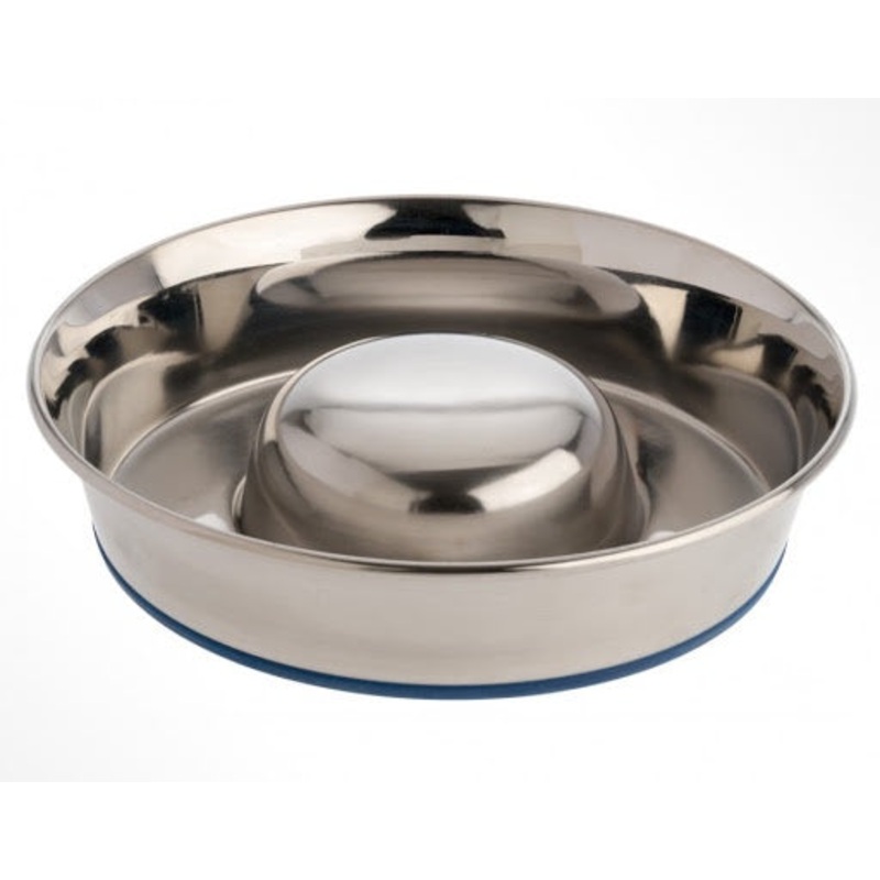 Premium Rubber-Bonded Stainless Steel Slow Feed Bowl MediumHolds up to 5 cups of dry foodBowls slow down eating, improving digestion and nutrient absorptionDishwasher safePatented bonded rubber bottom prevents slipping and slidingRapid eating can lead to d
