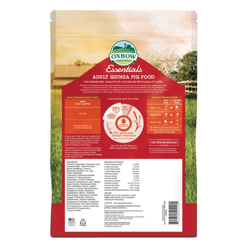 Oxbows Essentials - Adult Guinea Pig Food is formulated to meet the specific nutritional needs of adult guinea pigs and help them thrive. This complete and balanced adult guinea pig food contains Timothy hay for healthy digestion and all the wholesome ingr