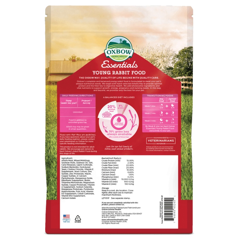 Oxbows Essentials – Young Rabbit Food is formulated to meet the specific nutritional needs of young rabbits and help them thrive. This complete and balanced young rabbit food contains Alfalfa hay to provide optimal protein and fiber for healthy digestion. We add wholesome ingredients and vital nutrients to support daily function and performance, making Essentials – Young Rabbit Food the ideal diet for young and growing rabbits.