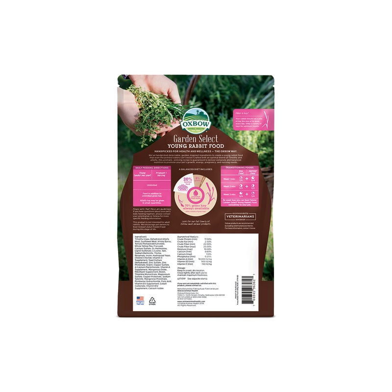 Weve handpicked delectable, garden-inspired ingredients to create a young rabbit food that even the pickiest eaters cant resist! Crafted with an optimal blend of Timothy and alfalfa, this aromatic, enticing recipe is guaranteed to deliver complete and balanced nutrition to promote your pets growth, energy, pregnancy, and nursing needs.