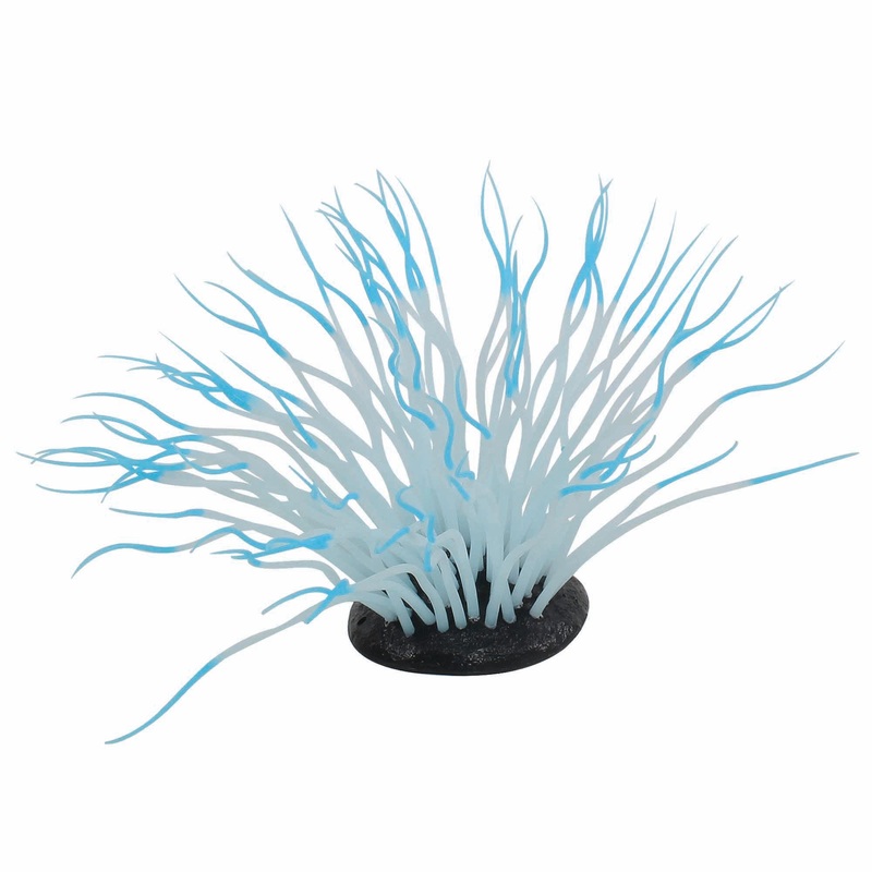 This artificial anemones sway with your tanks water, creating a charmingly realistic display of movement. It also provide a nice place for fish to hide, play, and explore! Theyre safe for both freshwater and saltwater tanks. While the Silicone Sea Anemones is something to behold, its beauty and extravagance is greatly enhanced when displayed under blue light! The already vivid blue pops even more, enticing you to keep the light on! Because this aquarium ornaments will not glow on their own, youll need a blue aquarium light in order to get their illuminating effect. Feature a suction cup base. This allows you to place them anywhere in your tank! For a strong and secure bond, please clean the desired location beforehand, and rinse the suction cup with water. This ensures that the aquarium ornament will stay in place. This decor measures: 2.7 (D) x 2.7 (W) x 5 (H).