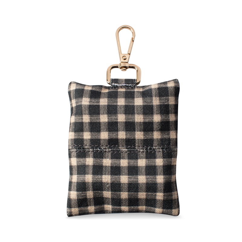 Pet Shop By Fringe Studio Painted Gingham dog waste bag holder features all over printed cotton canvas with metal clip and zip opening for easy refill. includes 2 rolls of plastic waste bags, 30 bags total. holds 2 rolls of standard waste bags for future refill.