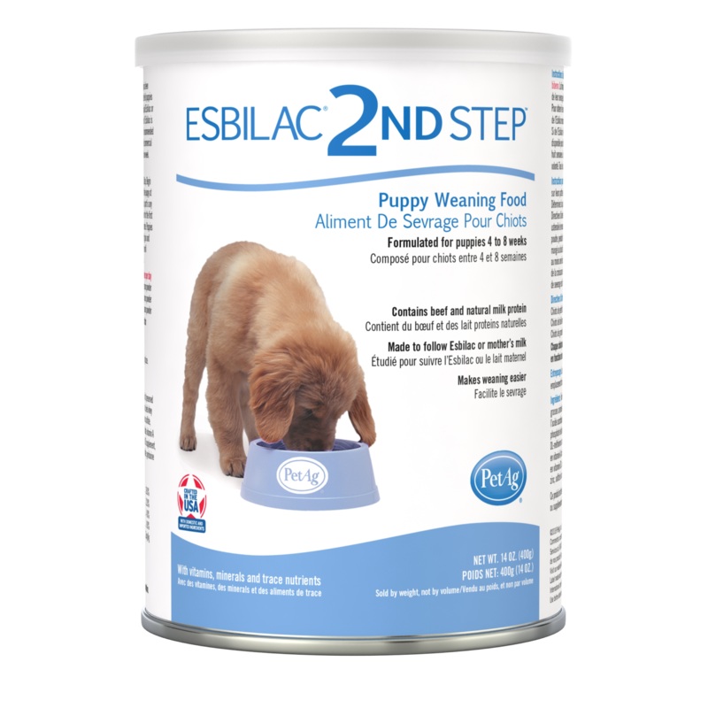 Directions for Feeding:Esbilac 2nd Step should be lapped out of a bowl and not fed from a bottle. Esbilac 2nd Step has been formulated to meet the nutritional needs of young puppies being weaned from mother or bottle fed puppies progressing to solid foods. For best results, the product should be mixed with ready-to-feed liquid Esbilac or reconstituted powder Esbilac to give the consistency necessary to get good food consumption. If Esbilac is not available, water may be used. Fresh, clean water should always be available for drinking. It is recommended that Esbilac 2nd Step be fed until puppies are 7 or 8 weeks old when they can be fed commercial puppy or dog food as desired. All changes in diet should be made gradually over a period of one week.