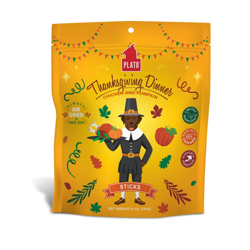 Plato Thanksgiving Dinner treats are soft & chewy, made with environmentally sourced cage-free chicken and pumpkin rich in fiber to support digestion, naturally preserved and contain no artificial flavors with limited ingredients that you can trust.Special