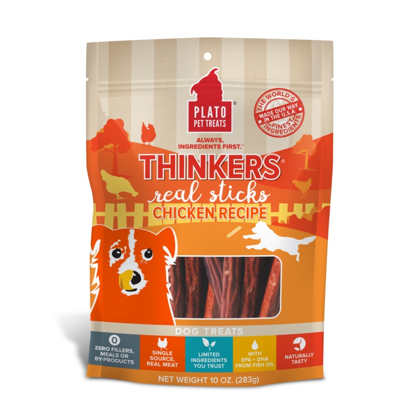 Sticks that do the trickThinkers Chicken arehearty, meat-packed stickswithadded EPA and DHA to support healthy brain function. Made withreal chicken as the 1st ingredient, these treats are made withlimited ingredients, arenaturally preserved, and containno