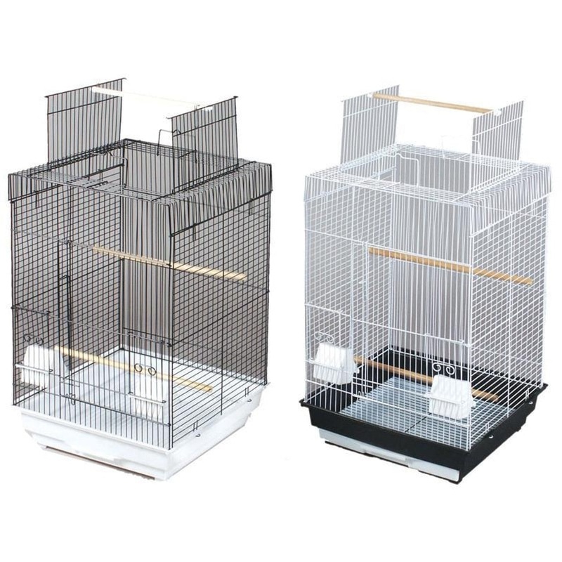 Playtop roof opening with perchFeatures a removable bottom grille and pull-out drawer for easy cleaning.Includes 2 plastic hooded cups and 3 wood perches and is designed for parakeets, cockatiels and other small to medium birds
