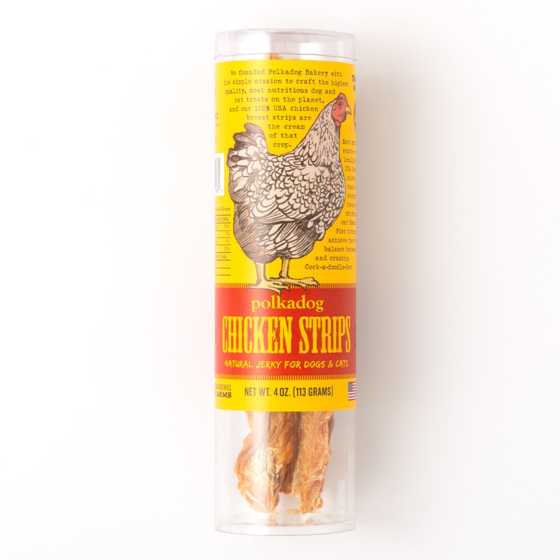 Each batch of chicken strips for dogs starts with locally sourced USA farm-raised chicken. We hand strip and gently dehydrate the chicken in our Boston kitchen to achieve the perfect balance between meaty and crunchy. Cock-a-doodle-doo! Ingredients: Chicke