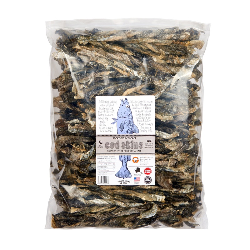 Fish Jerky Treats for Dog & CatsAt Polkadog, we're all about locally sourced, made-in-the-USA, limited ingredient natural dog treats. Our super-duper fish skin dog treats are no exception. The cod we use to make these cod skins for dogs is caught wild in s