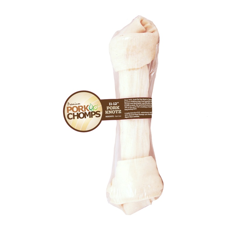 Premium Pork Chomps 11 Baked Knots are fully digestible and the perfect rawhide alternative for your pup!! Pork Chomps are made from baked pork skin creating a healthy, low fat, high protein dog chew. This wholesome chew is made with limited ingredients, free of artificial flavors, dyes and preservatives, and preferred by dogs everywhere! Premium Pork Chomps are the long lasting rawhide alternative that will keep you pup constructively chewing for hours! In 2012, The University of Illinois College of Veterinary Science conducted a study which proved pork skin to be 99.9% digestible and significantly more digestible than beef rawhide. Offering a variety of sizes, shapes and flavors, Premium Pork Chomps is the chew dogs crave and pet parents can feel good about too! Safe and Healthy Premium Pork Chomps 11 Baked Knots are the right size for Large Dogs and Extra Large Dogs. Single Count Package. Ingredients: Pigskin, Sugar. Guaranteed Analysis: Crude Protein (Min) 75%, Crude Fat (Min) 2%, Crude Fiber (Max) 2%, Moisture (Max) 13%