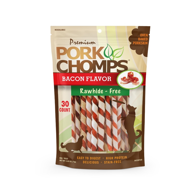 Premium Pork Chomps 5 Baked Mini Twists with Bacon Flavor Wrap are fully digestible and the perfect rawhide alternative for your pup!! Pork Chomps are made from baked pork skin creating a healthy, low fat, high protein dog chew. This wholesome chew has no