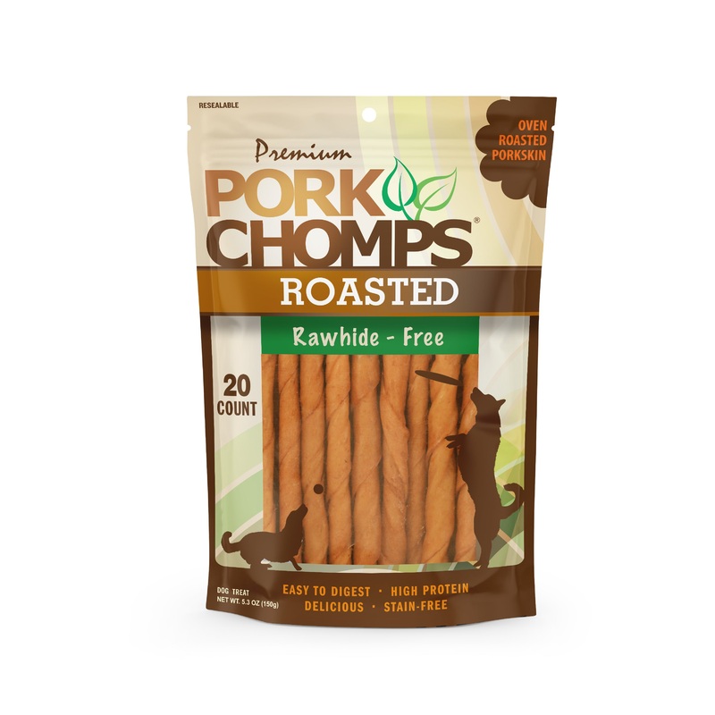 Premium Pork Chomps 5″ Roasted Mini Twists are fully digestible and the perfect rawhide alternative for your pup!! Pork Chomps are made from baked pork skin creating a healthy, low fat, high protein dog chew. This wholesome chew is made with limited ingredients, free of artificial flavors, dyes and preservatives, and preferred by dogs everywhere! Premium Pork Chomps are the long lasting rawhide alternative that will keep you pup constructively chewing for hours! In 2012, The University of Illinois College of Veterinary Science conducted a study which proved pork skin to be 99.9% digestible and significantly more digestible than beef rawhide. Offering a variety of sizes, shapes and flavors, Premium Pork Chomps is the chew dogs crave and pet parents can feel good about too! Safe and Healthy Premium Pork Chomps 5″ Roasted Mini Twists are the right size for Miniature Dogs, Small Dogs and Medium Dogs. 20 Count Resealable Package. Ingredients: Pigskin, Sugar. Guaranteed Analysis: Crude Protein (Min) 75%, Crude Fat (Min) 2%, Crude Fiber (Max) 2%, Moisture (Max) 13%