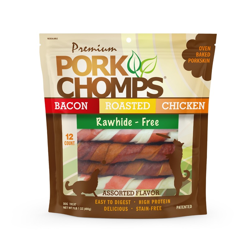 Premium Pork Chomps 6 Assorted Roasted, Chicken and Bacon Twists are fully digestible and the perfect rawhide alternative for your pup!! Pork Chomps are made from baked pork skin creating a healthy, low fat, high protein dog chew. This wholesome chew has no artificial flavors or preservatives, and is preferred by dogs everywhere! Premium Pork Chomps are the long lasting rawhide alternative that will keep you pup constructively chewing for hours! In 2012, The University of Illinois College of Veterinary Science conducted a study which proved pork skin to be 99.9% digestible and significantly more digestible than beef rawhide. Offering a variety of sizes, shapes and flavors, Premium Pork Chomps is the chew dogs crave and pet parents can feel good about too! Safe and Healthy Premium Pork Chomps 6 Assorted Roasted, Bacon and Chicken Twists are the right size for Small Dogs, Medium Dogs, and Large Dogs. 12 Count Resealable Package. Ingredients: Pigskin, Natural chicken flavoring, Natural bacon flavoring, FD&C Red No. 40, Blue No. 1, Yellow No. 6, Sugar. Guaranteed Analysis: Crude Protein (Min 75%, Crude Fat (Min) 2%, Crude Fiber (Max) 2%, Moisture (Max) 13%