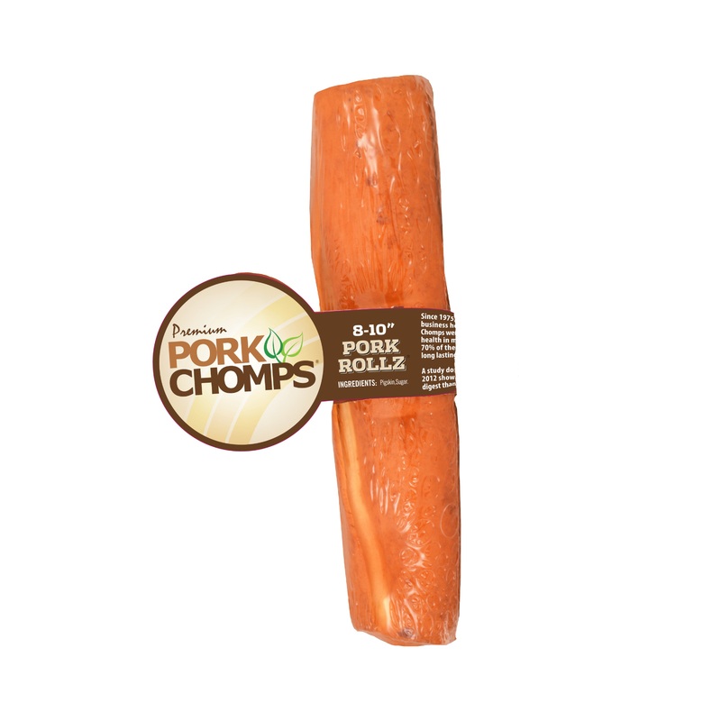 Premium Pork Chomps 8" Roasted Pork Skin Rolls are fully digestible and the perfect rawhide alternative for your pup!! Pork Chomps are made from baked pork skin creating a healthy, low fat, high protein dog chew. This wholesome chew is made with limited in