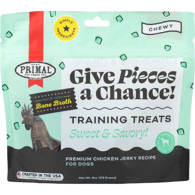 PRIMAL PET FOODS CHICKEN JERKY PIECES FOR DOGS GIVE PIECES A CHANCE ARE INTENDED FOR INTERMITTENT OR SUPPLEMENTAL FEEDING ONLY. THIS IS NOT A COMPLETE DIET.