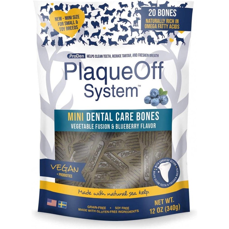 ProDen PlaqueOff Mini Dental Bones are dog chews with the PlaqueOff System which help clean plaque and tartar by abrasive action. Used daily, this natural product made with sea kelp can complement ordinary dental hygiene. Available in two tasty flavors, Vegetable Fusion and Vegetable Fusion Blueberry.