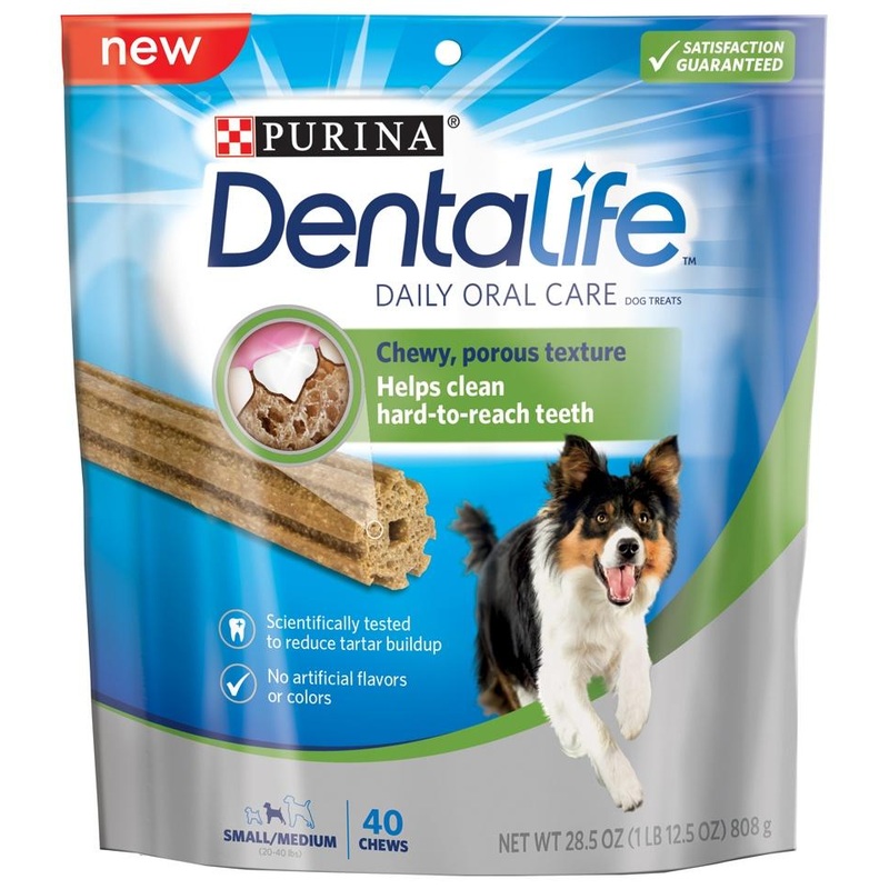 Part of caring for your dog’s health is helping him to maintain healthy teeth, and Purina DentaLife Daily Oral Care small/medium adult dog treats help you do that. We craft these tasty dog chew treats with wholesome ingredients and without any artificial colors or flavors, so you can feel good about the snacks you serve your beloved dog. This DentaLife product gets your dog chewing to clean even those hard-to-reach teeth in the back of his mouth and promote fresh breath. Our formula is scientifically tested to reduce tartar buildup and accepted by the Veterinary Oral Health Council (VOHC) as a product that effectively reduces tartar buildup when used as directed. Make these dog treats a part of your dog’s daily oral care routine, and serve them according to the feeding instructions based on his weight as an addition to your dog’s complete and balanced diet. If you have more than one dog in your household, explore our full line of DentaLife dog treats to find the right option for each dog’s size. We know you care about where your dog’s foods and treats are made, which is why we proudly produce this formula in our Dunkirk, New York facility. Our dedicated staff works hard to ensure quality is the #1 priority in everything we do, and each batch undergoes safety and quality checks to provide you with added peace of mind. Rest assured knowing that the science behind these treats is backed by more than 90 years of Purina’s commitment to helping make pets’ lives better. We package these adult dog treats in resealable pouches to preserve freshness and to provide a convenient way to serve your dog the treats that help keep his teeth clean and breath fresh. Offer him Purina DentaLife Daily Oral Care small/medium adult dog treats, and let him know how much you care about his health and happiness with every mouthwatering bite.