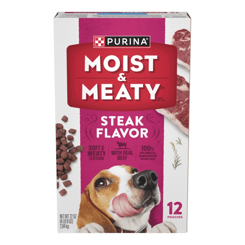 Serve up the smiles for your dog with Purina Moist and Meaty Steak Flavor adult dog food. The convenient individual Purina Moist and Meaty dog food pouches make it easy to fill their bowl with a 100 percent complete and balanced meal for adult dogs, offeri
