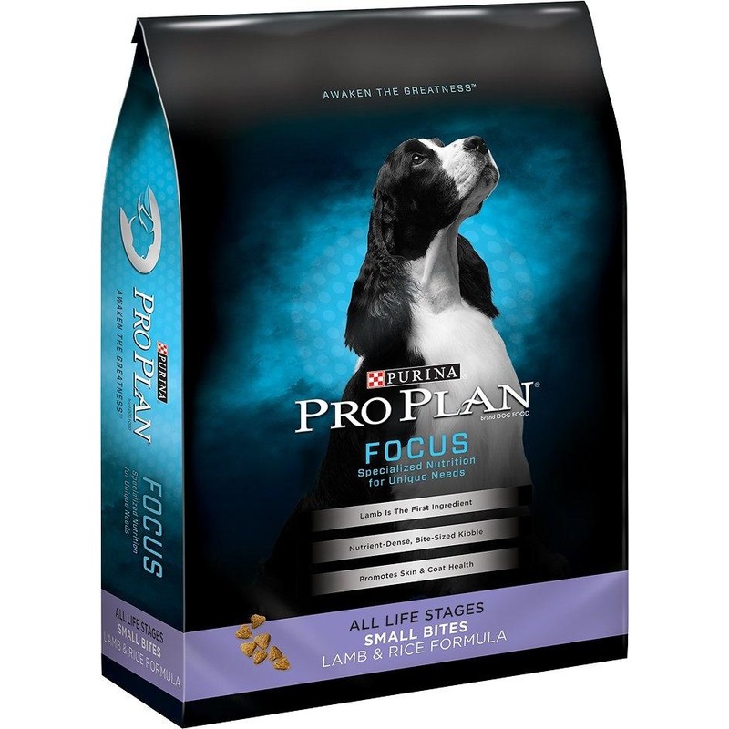 Let your dog enjoy the tempting taste of Purina Pro Plan FOCUS Small Bites Lamb & Rice Formula All Life Stages dry dog food, and give him the nutrition he can count on through every stage of his life. This super-premium dry dog food contains vitamin A and linoleic acid, an omega-6 fatty acid, for healthy skin and coat, so he can look his very best, and our highly-digestible dry formulas promote nutrient bioavailability to deliver optimal nutrient absorption throughout his body. Every high-quality ingredient is carefully chosen for a specific nutritional or functional purpose. For dogs who prefer a moist dog food formula, explore our full line of Purina Pro Plan wet foods, and give your best buddy outstanding flavor while continuing to provide him with excellent nutrition to help him reach his full potential. As a pet owner, you look for ways to provide your best buddy with the nutrition he needs to thrive and achieve greatness. This Purina Pro Plan FOCUS recipe makes it easy to do just that. Purina Pro Plan was the first dry dog food brand to use and be founded on the idea of using real meat as the #1 ingredient, and our Purina Pro Plan products are trusted and recommended by hundreds of veterinarians, breeders and rescue groups nationwide. Proudly manufactured by Purina in company-owned facilities located in the United States, each Purina Pro Plan FOCUS formula is backed by over 85 years of research, and we only use high-quality ingredients to create pet foods your dog loves to eat and that you can feel good about feeding him. Serve up a bowlful of Purina Pro Plan FOCUS Small Bites Lamb & Rice Formula All Life Stages dry dog food, and give your dog the specialized nutrition he needs to maintain his active lifestyle through every stage of life.