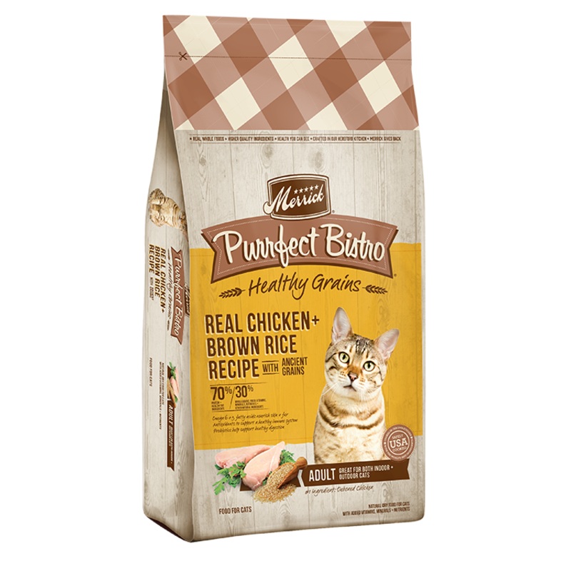 Merrick Purrfect Bistro Healthy Grains Real Chicken and Brown Rice Recipe is high in protein with moderate fat levels and low levels of carbohydrates - the kind of diet cats thrive on. Our formula is fortified with vitamins, minerals, probiotics, and antio