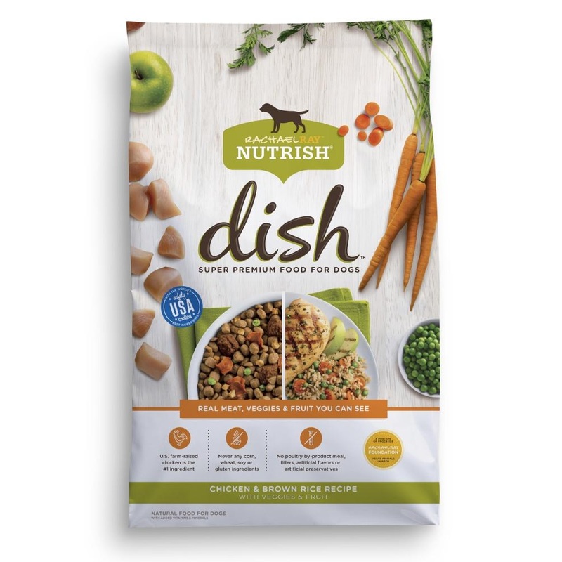 DISH Chicken & Brown Recipe from Rachael Ray Nutrish is made with simple, natural ingredients and added vitamins & minerals. Real U.S. farm-raised chicken is always the number one ingredient, and there are never any corn, wheat or soy ingredients. You’ll also see we’ve added in real pieces of slow roasted chicken, carrots, peas, and apples for a whole taste your dog will love.