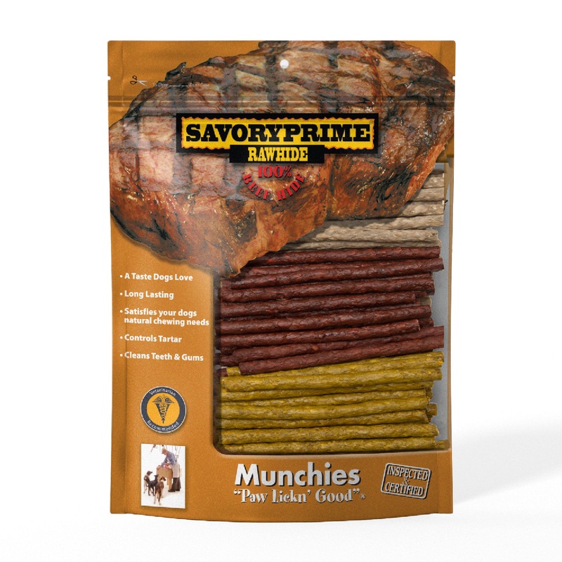 Dogs love Savory Prime Munchies Sticks. These rawhide sticks are soft and crumble easily making them great for younger and older dogs and light to moderate chewers. Handcrafted with three delcious options in every bag, you can choose from beef, chicken, an