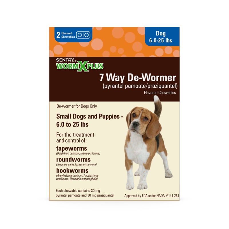 This broad spectrum de-wormer controls two types of tapeworms, two types of roundworms, and three types of hookworms in small dogs and puppies. SENTRY HC WORM X PLUS 7 Way De-Wormer contains two active ingredients found in veterinary brands: pyrantel pamoa