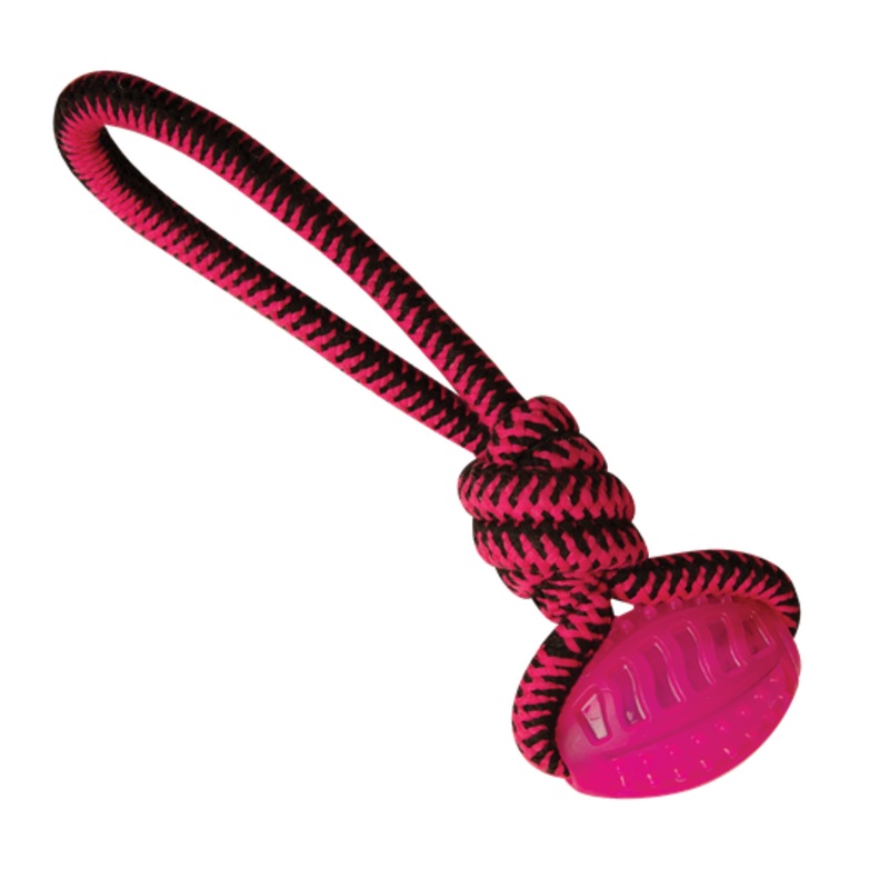 Your pup will love to tug, chew and play fetch with this toy! The tug buddy is sure to make your pet happy! This rope toy is made of a stretchy cotton rope, making it the perfect toy for a game of tug-of-war and features a rubber football that your pet will love to chew.