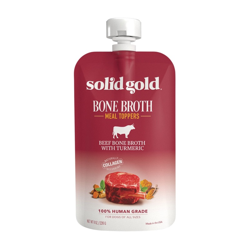 Add a nutrient-rich and delicious flavor to your pups meal when you add Solid Gold Beef Bone Broth with Turmeric Dog Food Topper. This delectable topper is made with real, human grade beef bone broth and is rich in naturally occurring collagen, as well as vitamins and minerals essential for overall wellness. Added turmeric provides an aromatic and flavorful treat that even the pickiest eaters will love. Plus, this broth is easy for pet parents to use simply add two tablespoons to your dogs food as a tasty topper, use to moisten dry food for dogs with sensitive teeth, add to water for added flavor and to encourage proper hydration or serve on its own as a tasty treat.