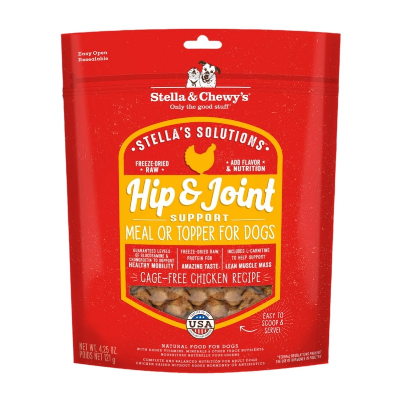 Stella & Chewys Stellas Solutions Hip & Joint Boost Cage-Free Chicken Dinner Morsels is a grain-free recipe that is crafted with freeze-dried, raw cage-free chicken, along with other wholesome ingredients like New Zealand mussels, turmeric, flaxseed and kelp. The hip and joint support comes from guaranteed levels of glucosamine and chondroitin, L-carnitine, and omega-3 fatty acids like EPA and DHA, which help encourage healthy mobility and lean muscle mass. Its made in the USA with added vitamins, minerals and taurine and contains NO wheat, grain, gluten, corn, soy and artificial preservatives, colors and flavors. Stella and Chewys Dinner Morsels Dog Food can be served as a mixer, a topper or as a complete and balanced meal for your adult dog.