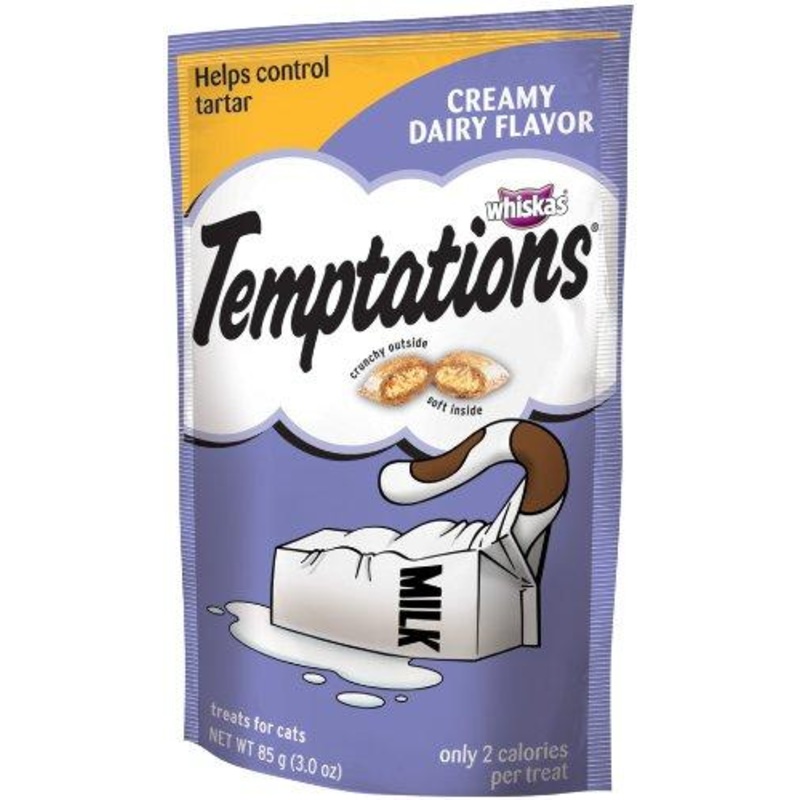 TEMPTATIONS Creamy Dairy flavored cat treats have under 2 calories each and no artificial flavors. So, rest assured, your cat will come running for this delectably satisfying treat with a crunchy outside and soft inside.