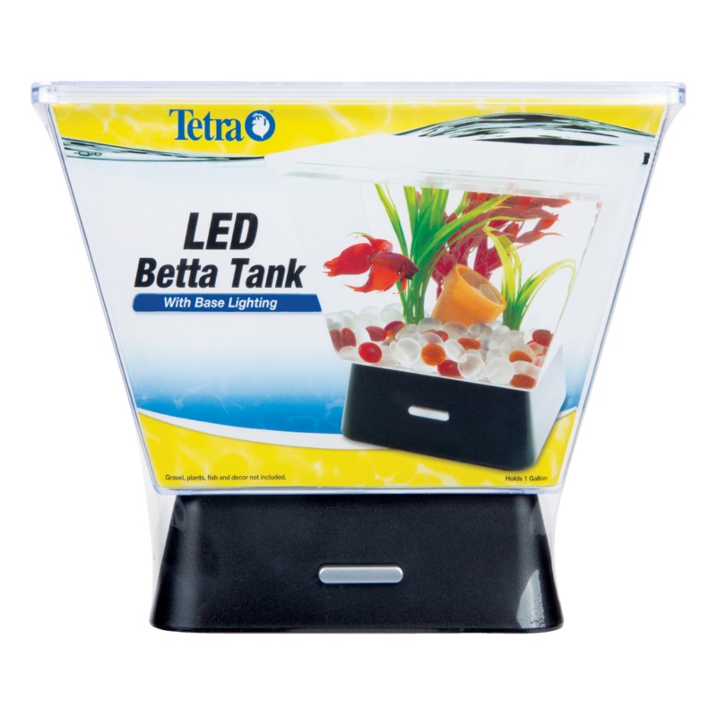 Tetra LED Betta Tank brings a splash of beauty to your home, office or dorm environment. It includes a seamless aquarium, a clear cover with feeding hole, and a black base with integrated LED lights that illuminate from below (requires AA batteries, not included). All you have to do is add gravel, plants, water and Betta fish to complete the look.