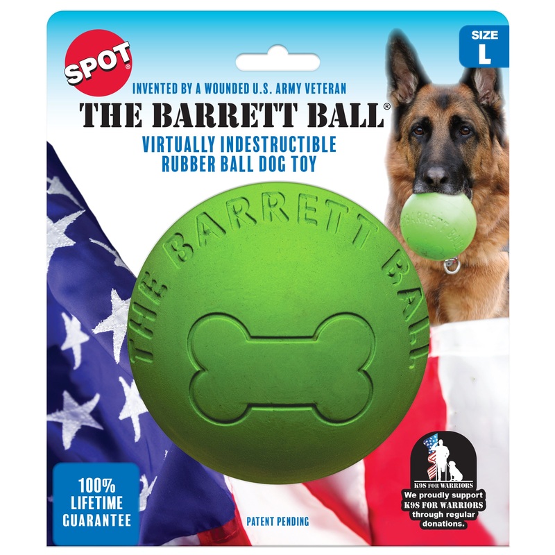 U.S. War Veteran, James Hayes, created and developed The Barrett Ball for his German Shepherd service dog, Barrett. James was wounded in action and discharged after honorably serving three tours of duty in Iraq and Afghanistan. He was diagnosed with both Post Traumatic Stress Disorder (PTSD) and a Traumatic Brain Injury (TBI). After a long wait, Barrett was assigned to James to help cope with his injuries. James was inspired to reward Barretts loyalty and hard work by developing a toy he could finally enjoy without destroying it after a short time. This is how The Barrett Ball was invented. A solid rubber ball that stood the test against the aggressive chewers tough jaws and teeth.