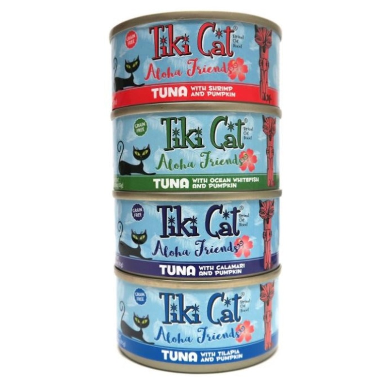 12-can Variety Pack featuring 4 Grain Free Flavors:3 cans of Tuna with Tilapia and Pumpkin3 cans of Tuna with Ocean Whitefish and Pumpkin3 cans of Tuna with Shrimp and Pumpkin3 cans of Tuna with Calamari and PumpkinMade with whole fish & pumpkin, Tiki Cat