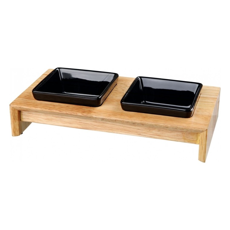 Features:2 ceramic bowls with stand - Smooth, making itsuitable for water as well as dry or wet foodSturdy stand made of varnished hardwood (rubberwood)Quiet:low noise and secure hold due to silicone bobbles between bowl and standNon-slip due to rubber fee