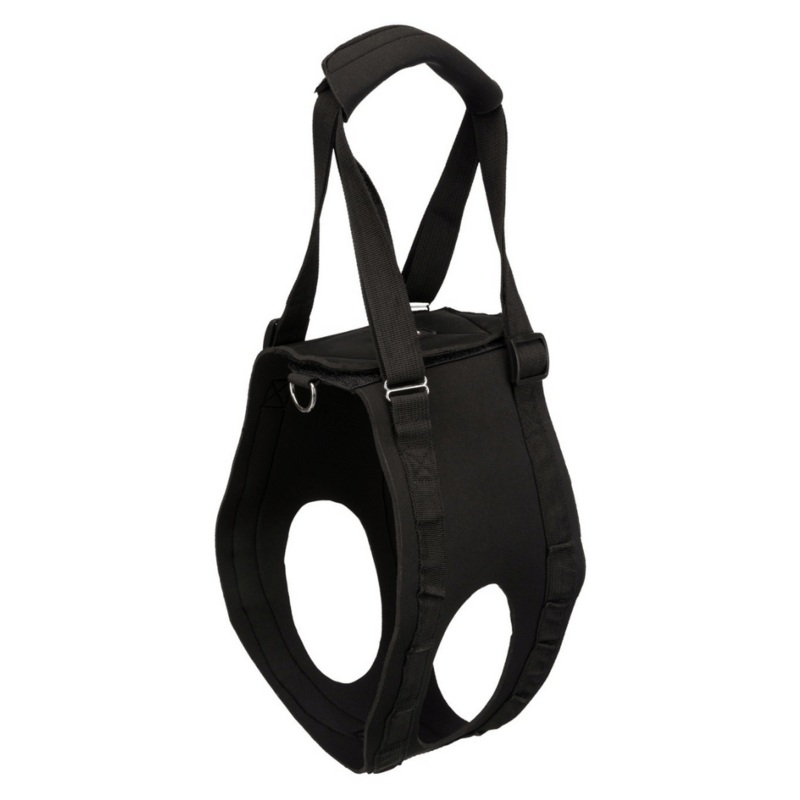- When putting on or while using the walking aid, pay attention that no body parts are constricted or pinched particularly with male dogs. Adjust the length of the handles so that you can comfortably stand upright next to your dog to avoid straining your own back..
