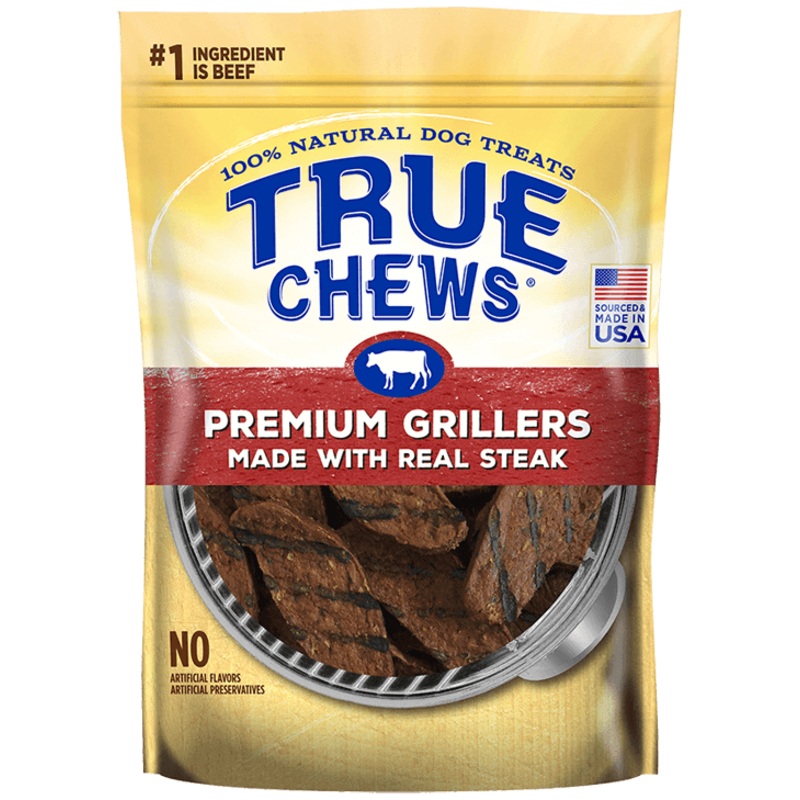 Made in the USA with real American, USA-sourced chicken, these 100% natural dog treats are the perfect everyday treat for your everyday amazing dog. True Chews Premium Grillers Dog Treats contain no corn, wheat or soy, no animal by-products, no artificial flavors or artificial preservatives.