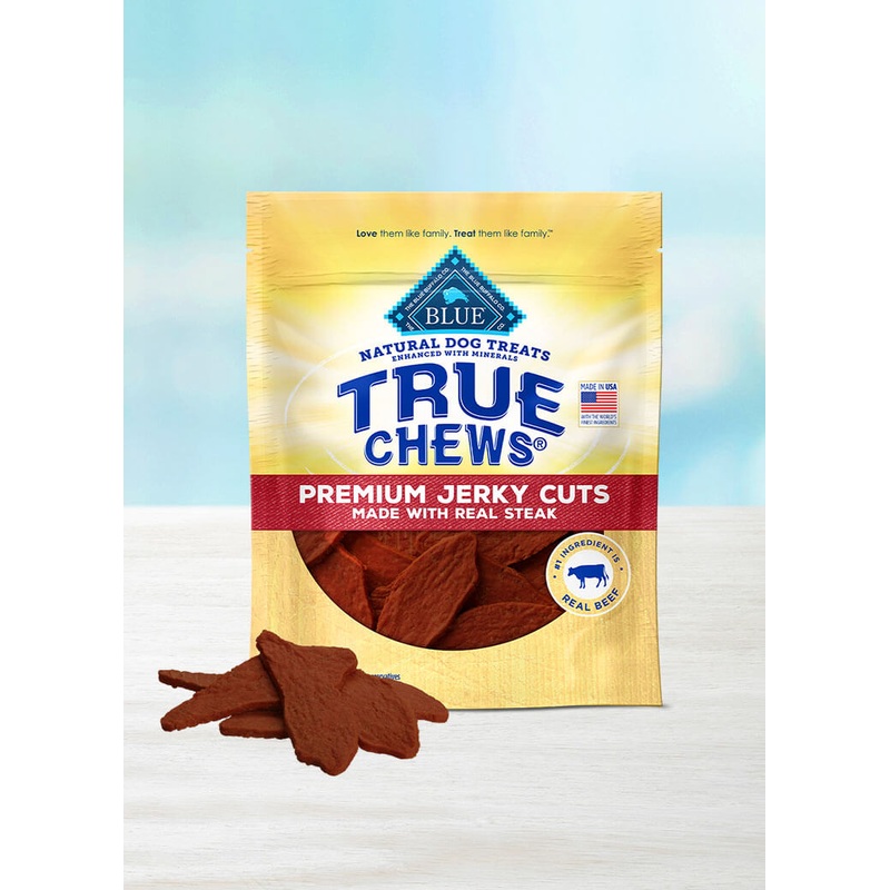 Give your dog a deliciously satisfying jerky treat with BLUETrue ChewsPremium Jerky Cuts. Made in the USA with just a few simple ingredients starting with realbeef, these irresistibly meaty jerky cuts are a healthy treat youll feel good about giving.