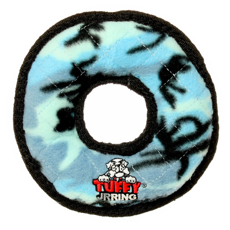 The Tuffy JR Ring is a great tug and fetch toy for dogs of all sizes. This toy is made with multiple layers of material that are bonded and sewn together to make one “Tuff” Layer. Each toy is then stuffed with safe, non-toxic fiber and sewn with multiple rows of stitching for extra strength and durability. Protective binding covers outside seams and makes the toy even stronger. The Tuffy JR Ring has multiple squeakers, sewn inside protective pouches for your dog’s safety, and to provide hours of fun and entertainment. Tuffy dog toys can also float and are best used as interactive play toys and not chew toys. Machine wash / Air dry.