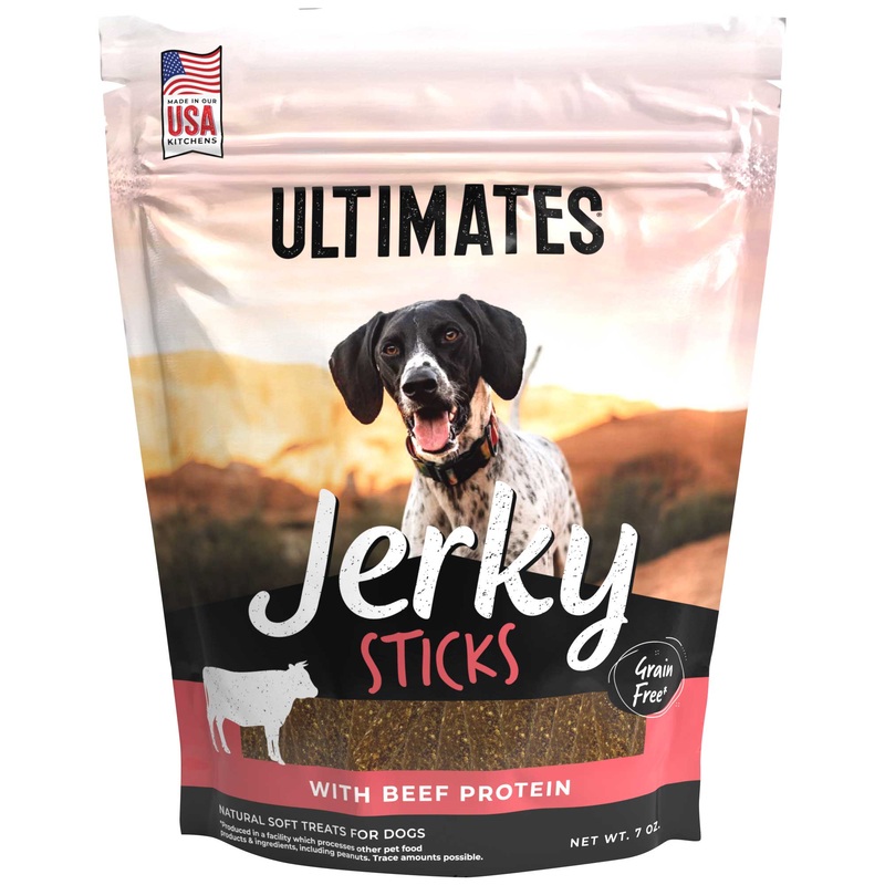Ultimates Jerky Beef Sticks are a tasty treat for your dog made in family-owned, USA kitchens. Crafted with high-quality beef protein as the first ingredient and vegetables like sweet potatoes, these grain-free jerky stick dog treats are perfect for training and sure to please any dog.