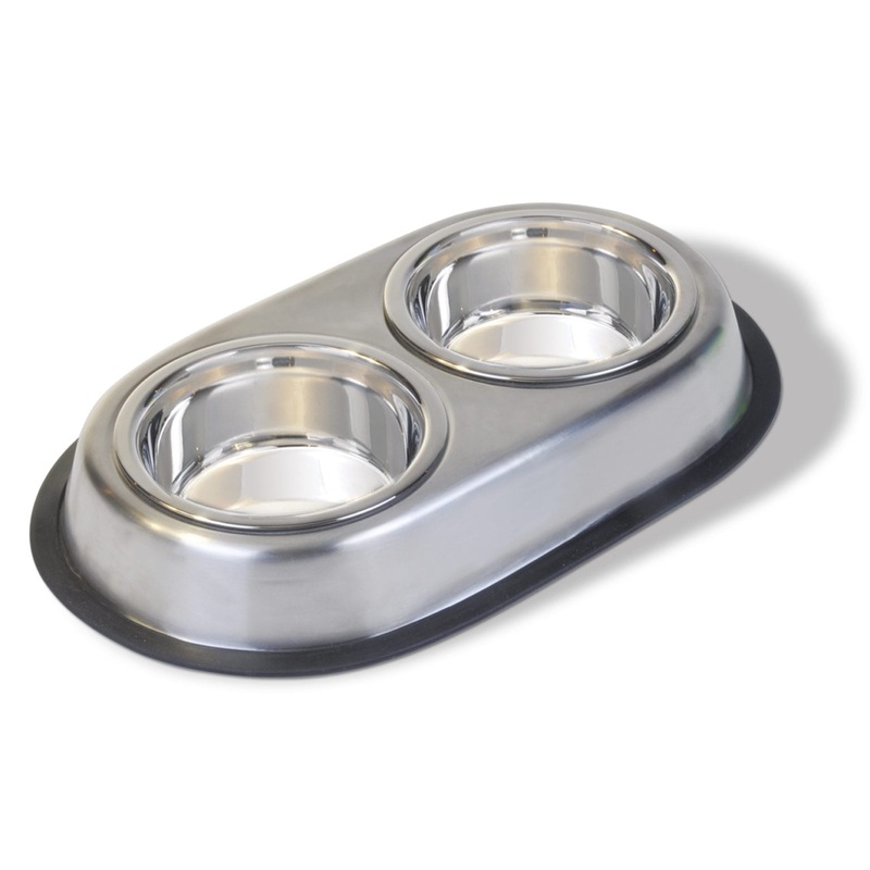 The Van Ness Stainless Steel Heavyweight Large Double Pet Bowl has a 32oz. capacity per side. Made with durable, polished stainless steel with Skid-proof rubber ring on the bottom.