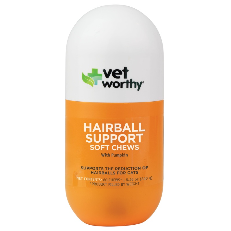 Vet Worthy Hairball Support w/ Pumpkin is for use in cats over the age of 12 weeks. Hairball Support w/ Pumpkin is available in 60 Soft Chews and works great for multi-cat households. Helps eliminate and prevent hairballs when used on a daily basis.Ingredi