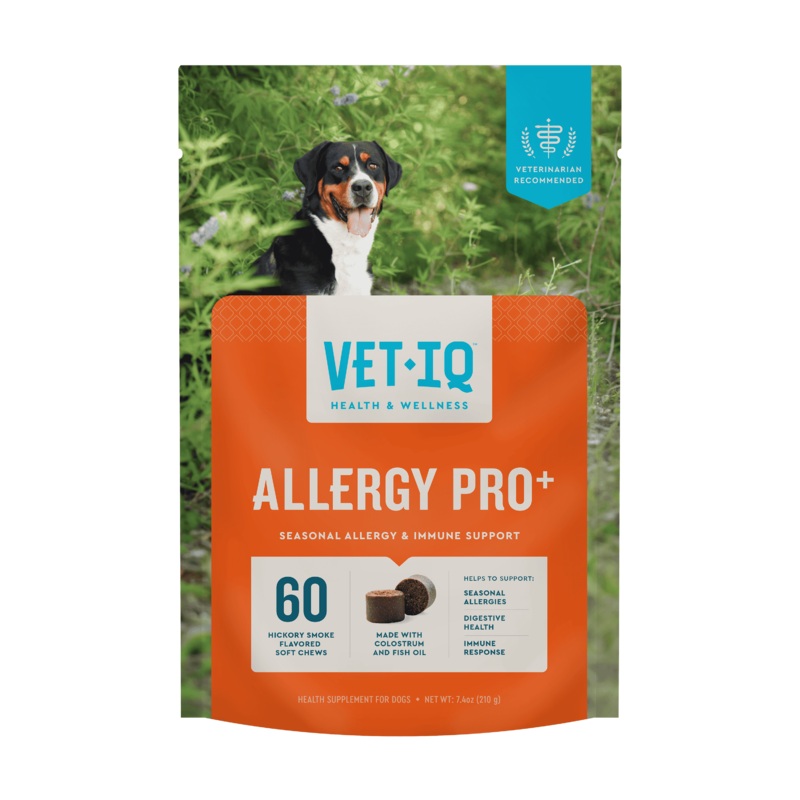 Vet IQ Allergy Pro+ is perfect when seasonal allergies and occasional irritations leave your pup feeling uncomfortable. Each soft chew is crafted with a thoughtful blend of high-quality ingredients like colostrum, astragalus root, and Sporeviaall chosen to promote your dogs immune health and digestive system. Colostrum supports the immune system, while astragalus root helps your dog naturally defend against allergens. Sporevia works as a powerful probiotic to encourage a balanced gut, which is essential for healthy skin, a shiny coat, and a strong immune system. These veterinarian-recommended soft chews are crafted in an irresistible hickory smoke flavor, so you can count on your dog enjoying every bite while receiving the daily seasonal allergy and immune support they need. With Vet IQ Allergy Pro+, youre giving your pup a tasty way to feel their best, inside and out.