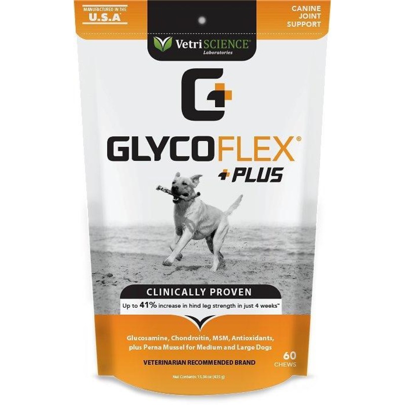 When your dog gets up more slowly to meet you and his leash at the door, you know hes not just tired. Its time for added joint support. Glyco Flex Plus, an advanced joint support supplement for dogs of any age, is clinically proven to increase hind leg strength up to 41% in just four weeks.* It combines glucosamine, chondroitin, Perna, DMG, MSM and important antioxidants to support your dogs everyday motion and comfort.